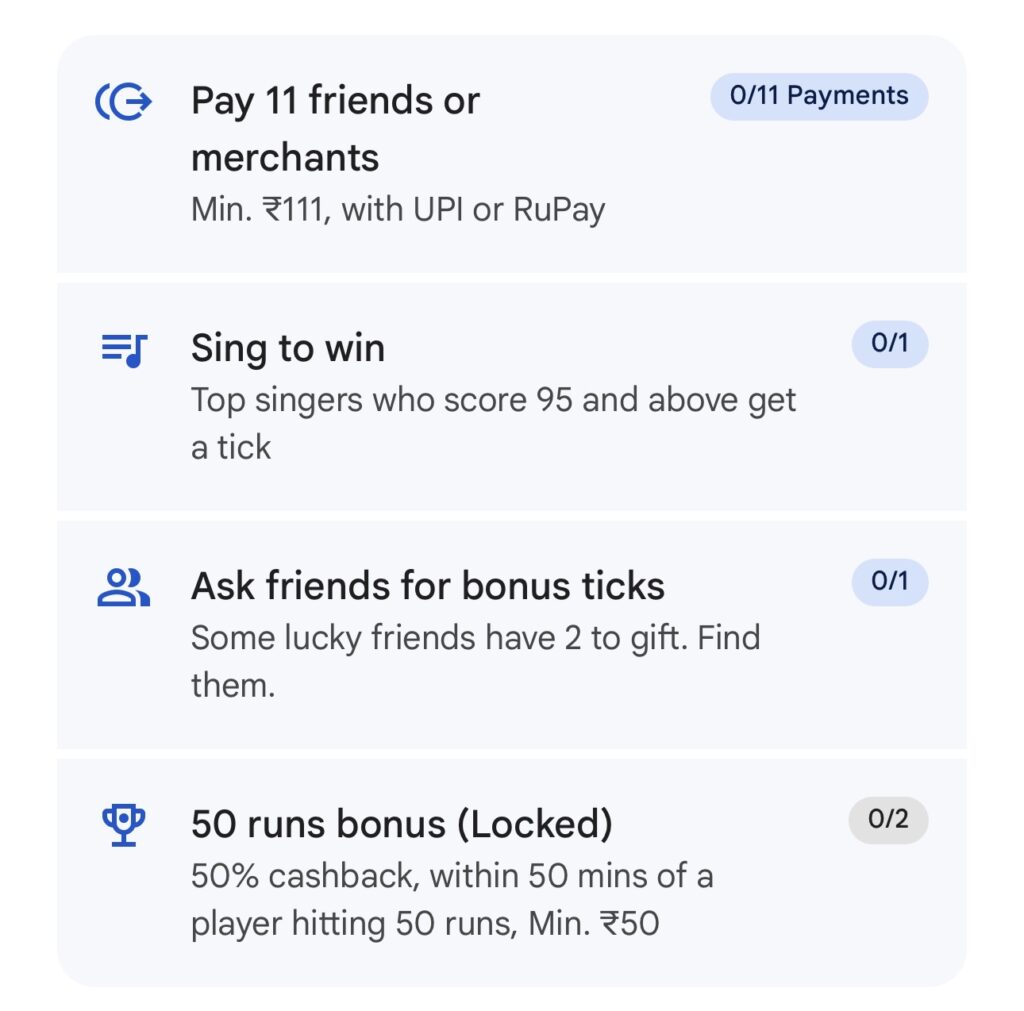 You can earn a maximum of 1 cashback reward after collecting all 5 ticks. The amount of cashback you earn from collecting all 5 ticks may vary from ₹5 – ₹1,001. In each case, all rewards given will be determined in real-time by an algorithm that may dynamically take into account a number of factors such as amount / type of cashback or voucher rewards that have already been distributed across all users; date / time the reward is earned; or other aggregated, cross-campaign metrics.